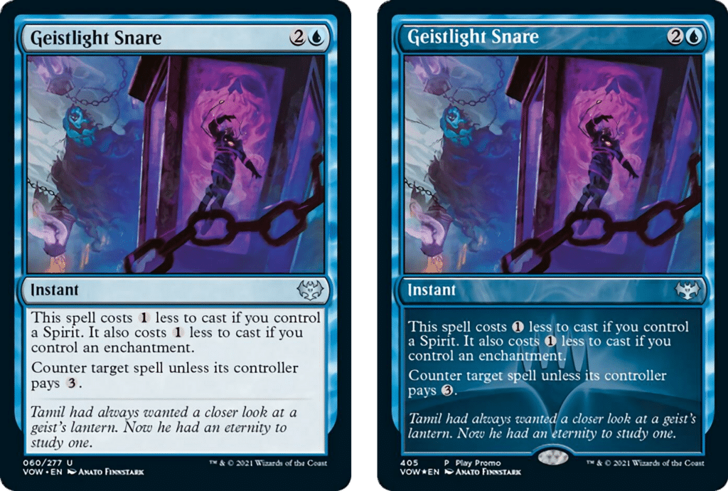Alongside Mana Leak, Geistlight Snare can counter any spell unless your opponent pays three mana to cast it. Expect to see the spell crop up in Azorius and Bant Spirits since the discount is easy to achieve, and in post-board matches, you can meet the enchantment criteria with cards like Rest In Peace. If you looking to play Spirits in Modern, Geistlight Snare is one to add to your deck.