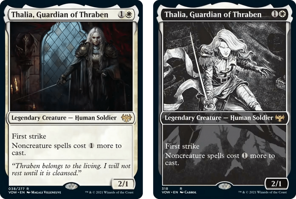 Admittedly a reprint, Thalia, Guardian of Thraben is a staple in Modern in Humans and Death & Taxes. However, if you are looking to pick up the Legendary Human Soldier for Modern, when Crimson Vow drops will be the best time to acquire these.