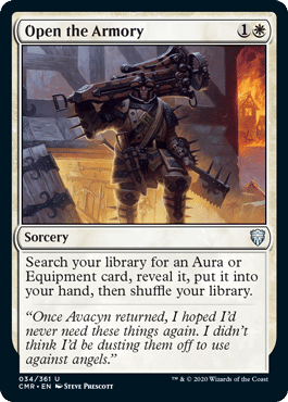 Next up is Open the Armory. Having a cheap way to search for an equipment or aura card from your deck can be a really powerful thing. Having the ability to pick and choose between an enchantment to remove a permanent or an equipment to push through more damage gives you an edge to deal with various situations in the game. Another cheap pick up here as well and under 50 cents.