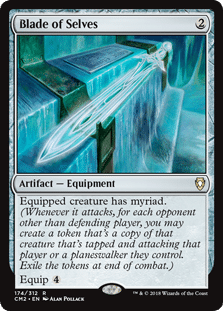 Our 3rd expensive pick is Blade of Selves. This powerful equipment lets us create copies of the equipped creature when we attack, which can yield some powerful results. Some key creatures in the precon that this could do well with would be Knight of Autumn, Cold-Eyed Selkie, or Acidic Slime. If you trade out some of the other creatures in the deck, this card gets even better.