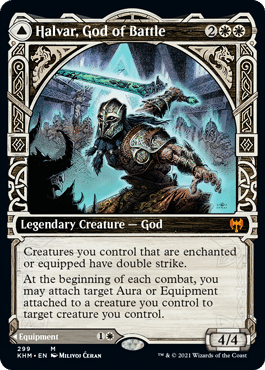 Last on the cheap upgrades is Halvar, God of Battle. This creature doubles up as an equipment as well, and both sides of the card are good. Usually, equipment will have abilities that trigger when the creature damages a player. Havlar giving equipped or enchanted creatures double strike triggers those abilities twice. We also get a similar effect to Ardenn, where we can move an equipment or aura to a new creature. This is on the upper end of the cheap upgrades, but you can find the showcase version for the same price to bring a little flair to your deck as well.