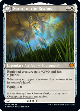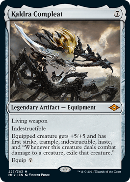 Our first expensive pick is Kaldra Compleat. The new power house living weapon equipment from Modern Horizons 2 is definitely one of the most powerful equipment out there. Living weapon is a strong ability, but the keyword soup that this equipment gives is incredible. Couple this with some of our cheaper picks, and you have a powerful combination.