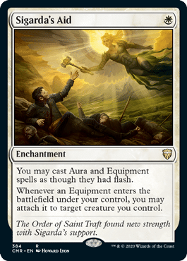One of the most powerful spells for this deck that you can get is Sigarda’s Aid. When you can flash in Auras and Enchantments, and essentially instant speed equip in the middle of combat is incredibly strong. Also you get the best equipment paring in the deck already in Colossus Hammer. For 4 dollars, this is an upgrade that brings up your deck’s power up quite a bit.