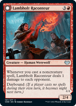 We’re finishing off this list with back-to-back red cards that have really found their feet across Standard and Commander since Crimson Vow’s release. Lambhold Raconteur is a decent four drop that will deal chip damage every time you cast a spell.