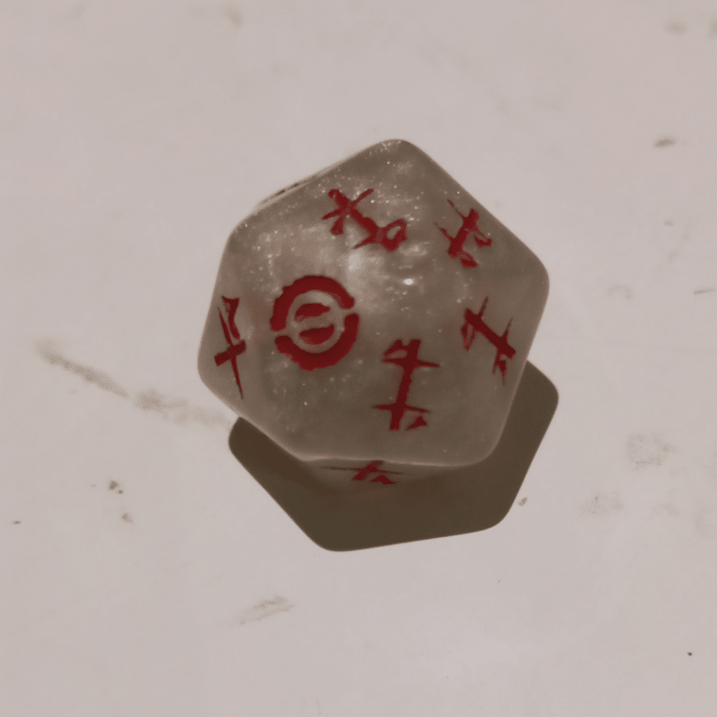 The Phyrexian Spindown die is a promotional item announced as a sort of ‘chase’ cosmetic that can be opened as part of your prerelease kit. Instead of the typical numerals that we expect when seeing an MTG prerelease spindown dice, we are instead met with the Phyrexian translation of these numbers.