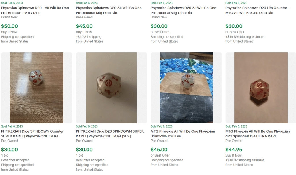 The most shocking thing about this bizarre chase inclusion is its secondary market value. Multiple sources cite players selling off their Phyrexian dice the night of the prerelease for an easy $50 in cash. While this seems like the high-end of prices this cosmetic has sold for, eBay completed listings indicate that the die sells for between $30 and $50 rather consistently. Considering that most spindown dice only go for about $5-10 according to eBay (and those are the ones that actually sell), this is a massive increase in price. This one dice will more than pay for your prerelease kit. All the cards past that point are pure profit.