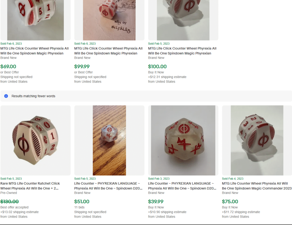 The most shocking thing about this bizarre chase inclusion is its secondary market value. Multiple sources cite players selling off their Phyrexian dice the night of the prerelease for an easy $50 in cash. While this seems like the high-end of prices this cosmetic has sold for, eBay completed listings indicate that the die sells for between $30 and $50 rather consistently. Considering that most spindown dice only go for about $5-10 according to eBay (and those are the ones that actually sell), this is a massive increase in price. This one dice will more than pay for your prerelease kit. All the cards past that point are pure profit.