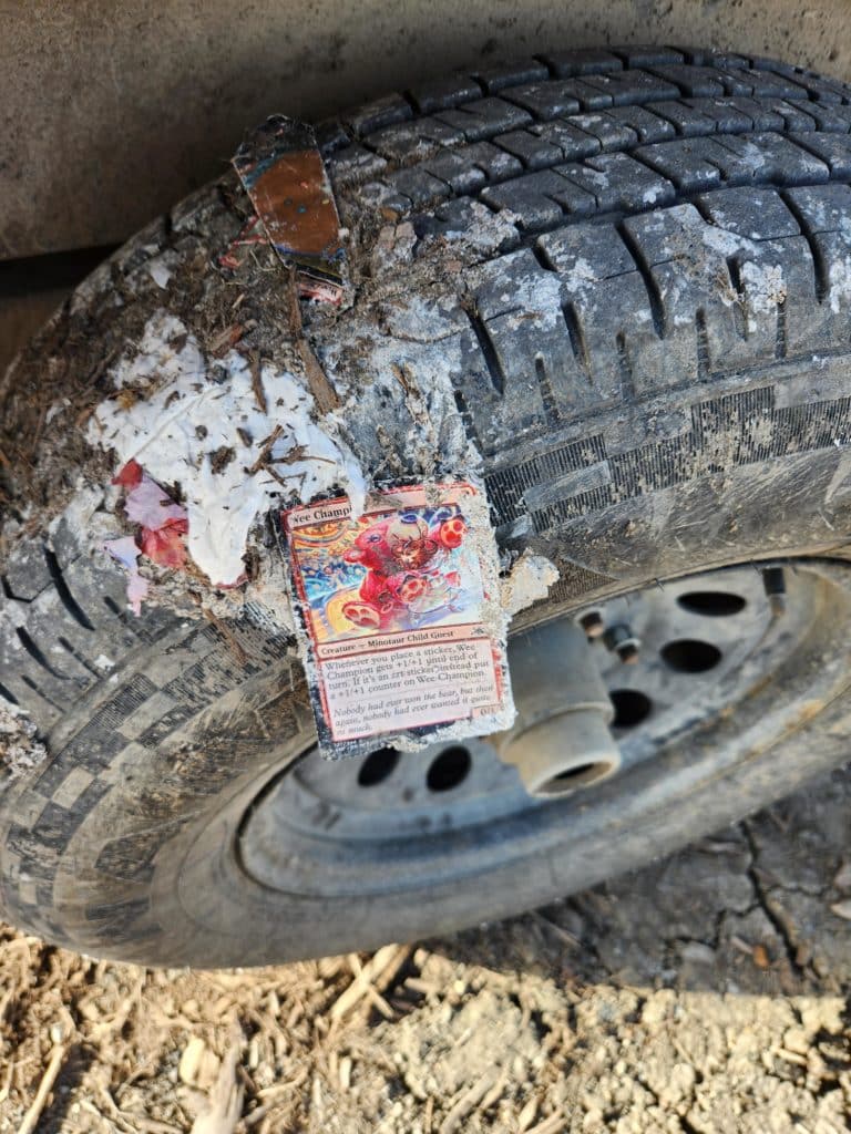Since the initial discovery of Modern Horizons Two packets, which reportedly retail for more than 250 thousand dollars on shelves, were discovered, more pictures from the mysterious dumping have surfaced. As you may expect, it’s not just these Blister Packs that got dumped. Tons of Unfinity and Secret Lair products were also found at the scene. Some of the Secret Lair products found in better condition by the ones who shared the pictures seemed to take them home since the cards were still in playable condition. Many of the cards found, like the Wee Champion stuck to the wheel above, were not as lucky.