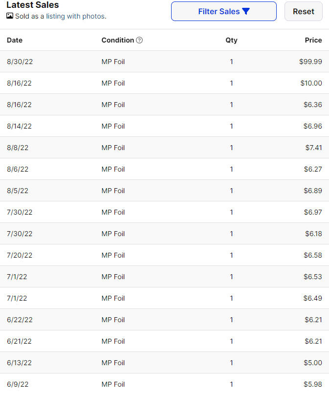 In addition to highlighting the outlier in recent sales, this snapshot of Moderately Played Klauth also highlights just how severe the spike to Klauth sales has really been. Only two days before the writing of this article, a Moderately Played version of Klauth sold for $100. This was also the last instance where Klauth saw some attention from us, and we mentioned that this particular sale might throw the market averages off. Signed cards on the MTG secondary market are considered Moderately Played at best. As a result, this $100 Klauth was most likely signed by a notable party, but we have no way to confirm this. While Klauth looks like a fantastic card when paired with many of Dominaria United’s cards, it is rather suspicious that Klauth saw a $10 increase only 24 hours after this sale was recorded.