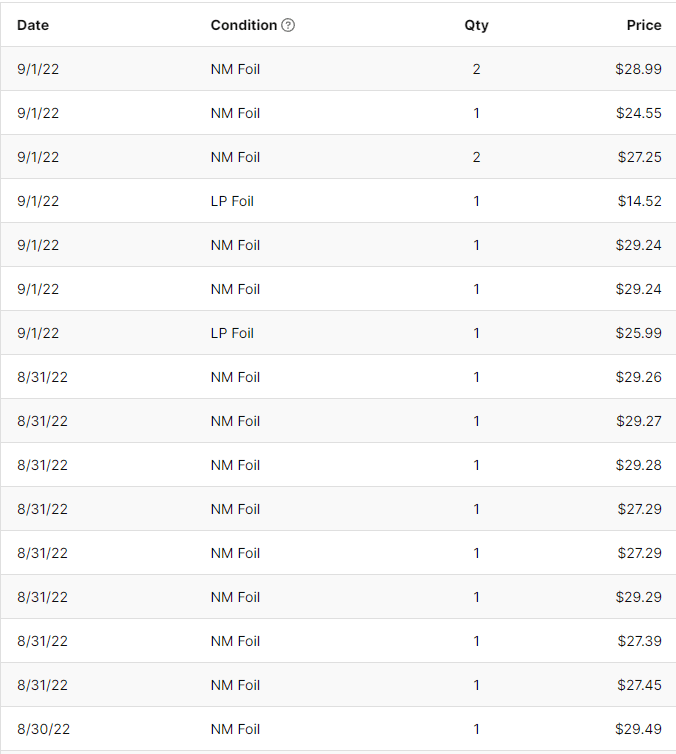 Here, we have a screenshot of TCGplayer’s most recent sales of Klauth, covering all of the sales from the 31st onward. The actual spike for this card occurred on the 30th, shortly after our article covering the card in passing (the focus was on zero mana artifacts like Jeweled Lotus and Mana Crypt, which have continued to increase). If you are looking for a Klauth at the moment, a price around $29 should be what you’re gunning for at the highest. Considering that some market averages assess this card for as much as $45, this suggests there will be higher listings than $29.