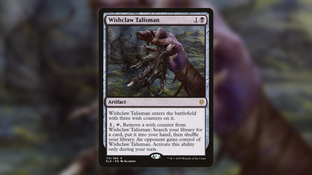 - Card Text: Wishclaw Talisman enters the battlefield with three wish counters on it. (1) (tap), Remove a wish counter from Wishclaw Talisman: search your library for a card, put it in your hand, then shuffle your library. An opponent gains control of Wishclaw Talisman. Activate this ability only during your turn.