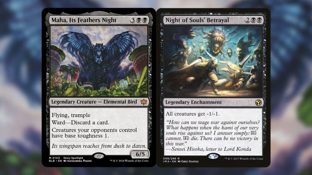 Maha makes all of your opponents creatures have Toughness one, and Night of Souls’ Betrayal gives all creatures -1/-1 as long as it sticks around. The card is an enchantment, so it has no reason to go anywhere outside of it being removed.
