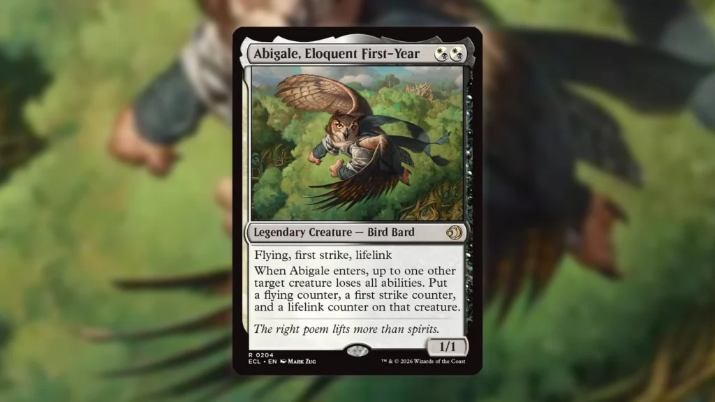 Nonetheless, the real meat of this card comes from its enters ability. In most cases, your best way to maximize Abigale, Eloquent First-Year’s trigger is to target one of your beefy creatures with it. While this does force the creature you target to lose all abilities, the Flying, First Strike, and Lifelink counters it gains will often outweigh whatever abilities you were forced to give up.