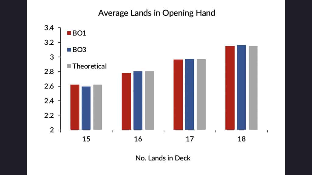 After making this declarative statement, Sierkovitz went on to prove their point rather effectively using a variety of insightful graphs. The first of these showcased how, despite how it may seem, George isn’t always ruining your opening hand. According to Sierkovitz’s math, and data from 17Lands, George is actually incredibly close to the expected true random average. For instance, according to math, in a 17-land deck, your opening hand should include three lands basically every single time. According to Sierkovitz’s data, which comprises several hundred thousand games, that’s almost precisely what George deals out.