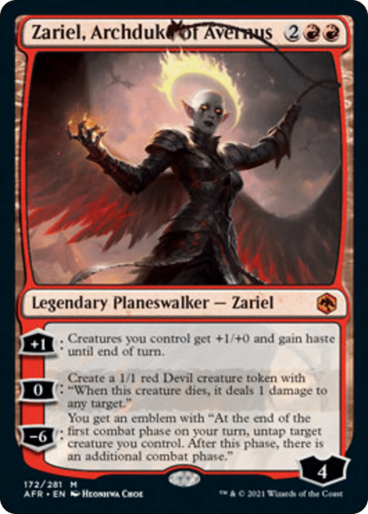 Zariel can give you creatures haste and +1+0 until end of turn with its first (+1) ability. For its second ability (0), it can create a 1/1 devil token that deals 1 damage to any target when it dies. The new planeswalker’s ultimate gives you an emblem that permanently lets you have an additional combat phase each turn.
