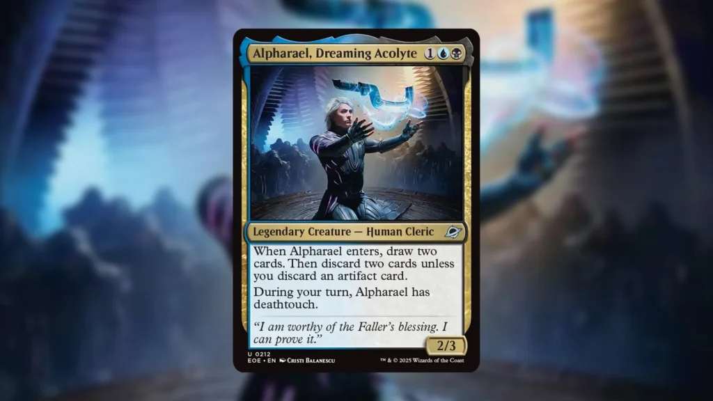 Tannuk, Memorial Ensign, for example, is perhaps one of the best Landfall damage effects we’ve seen for Commander. Not only does this fulfill a desirable niche, but it can even double as card advantage. Sadly, Alpharael, Dreaming Acolyte isn’t quite as interesting, but he does give us a hint of what else to expect in Edge of Eternities.