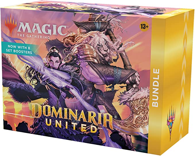 The MTG Dominaria United Bundle comes with eight Dominaria United Set Boosters, 40 basic lands (half are foil), a D20 MTG themed spindown die, and a small storage box. Strangely, the Dominaria United Bundle’s art is also featured on the Dominaria Set Booster Box. The good news is that it reinforces the suggestion of Liliana and Ajani seeing a new card in this set. This is currently retailing on Amazon for $43.95.