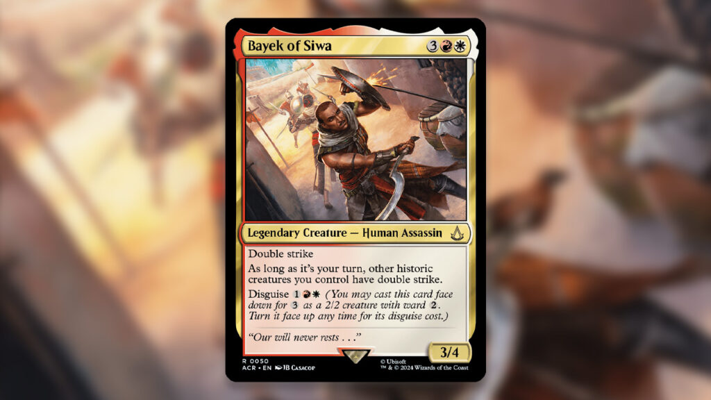 Bayek of Siwa is a very exciting card for Historic Commander decks that have Boros in their color identity. Thanks to the Disguise mechanic, Bayek can truly surprise opponents at a speed that can even get around Split Second. There are a lot of Commanders out there who want to deal combat damage, and granting those Commanders Double Strike is absolutely terrifying. This makes Bayek of Siwa a very real consideration in a wide range of different Commander decks.