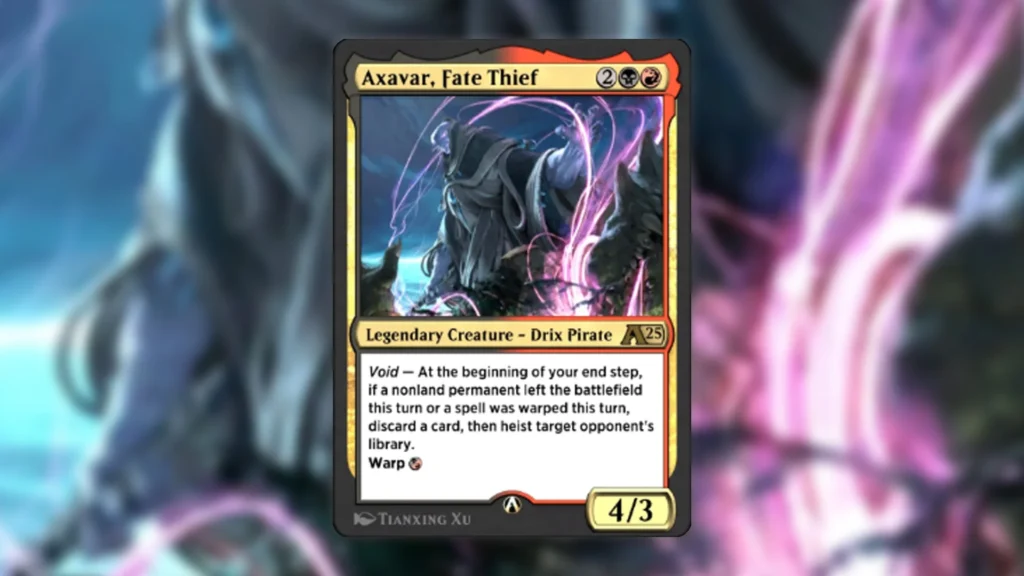 Axavar, Fate Thief is a unique card that mashes new and old mechanics together. The goal is to trigger Void in order to Heist your opponent’s library.
