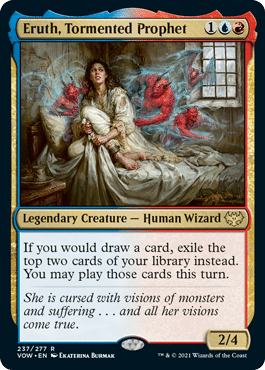 Eruth is a glass cannon. Anytime you’d draw a card, you instead exile the top two cards of your library and you may play those cards until the end of the turn, but only for that turn. That means if you don’t have the mana to play those cards, they are gone forever.