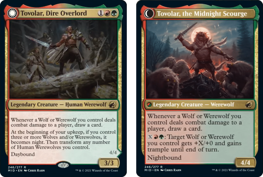 Tovolar, however, gets around this lunar contingency with a loophole. If you control three or more Wolves and/or Werewolves at the beginning of your upkeep, you can make it night and transform all of your Human Werewolves to their backsides. This even includes old Werewolf cards which don’t rely on the new Daybound mechanic.