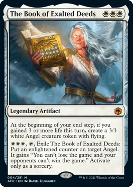 However, you can also pay three White mana and exile The Book of Exalted Deeds to put an enlightened counter on an Angel. The Angel then gains, “You can’t lose the game, and your opponents can’t win the game.” Now, you can’t do this at instant speed, but it’s still a very potent effect, and being able to put this on whichever Angel you choose makes it an essential card for any Angel deck.