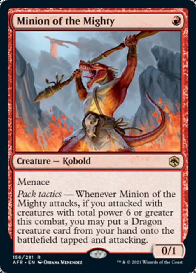 Of course, it also has pack tactics, which reads, “Whenever Minion of the Mighty attacks, if you attacked with creatures with total power 6 or greater this combat, you may put a Dragon creature card from your hand onto the battlefield tapped and attacking.” Nobody likes a surprise Dragon except the player taking advantage of it. That’ll be you though, so you’re going to love it.