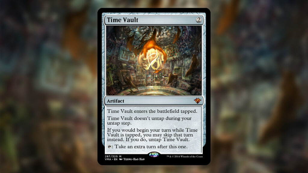 Printed way back in Alpha, Time Vault is a premier combo piece restricted in Vintage and banned in Legacy. On its own, Time Vault seems relatively unassuming. It basically lets you skip a turn to untap it, then tap it at any time to take an extra turn. If Magosi, the Waterveil is any indication, skipping a turn to later take an extra turn is not worth the cost.