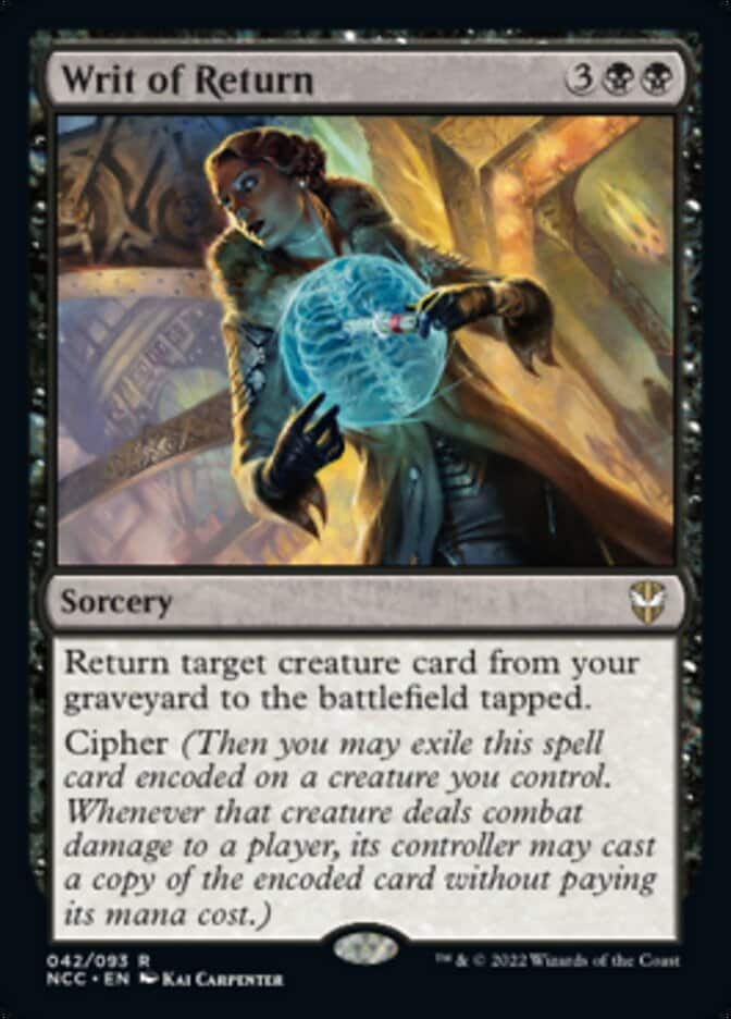 This is like an actually playable version of Beacon of Unrest. Sure, it still costs five mana, which is rather overcosted for a reanimation spell. But Writ of Return has cipher making it recastable.