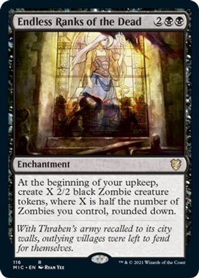 Endless Ranks of the Dead is a must include for zombie-themed Commander decks. Turn after turn, it lets you grow your hoard of zombies exponentially until they overwhelm your opponents.