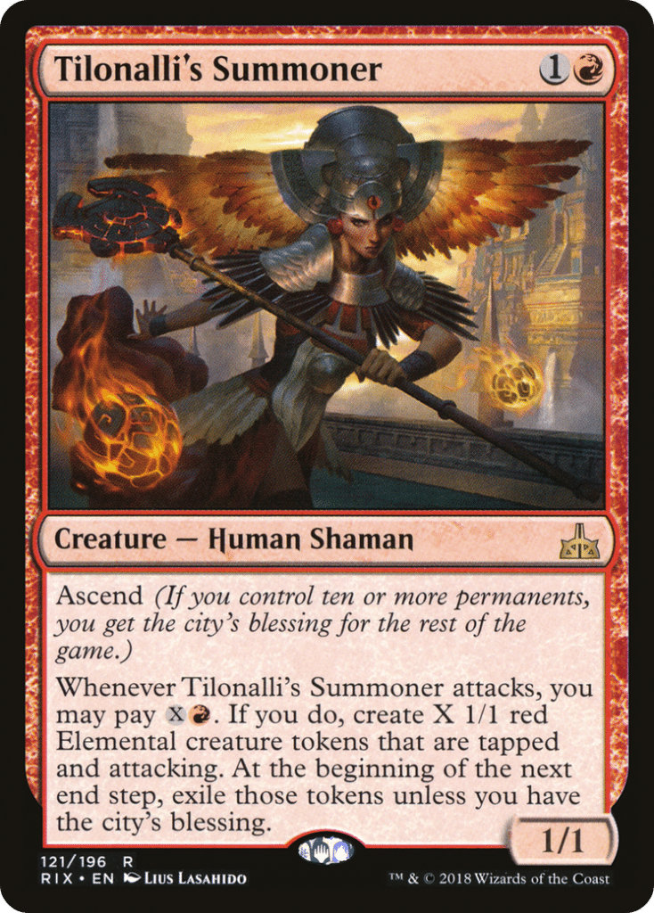 While possibly a slightly gimmicky card, that takes a little while to get going, there are few token generators more fun than Tilonalli’s Summoner. A two mana 1/1 that allows you to pay red and X in order to generate X attacking 1/1 Red elemental tokens whenever it attacks. If you don’t have 10 permanents in play, these tokens are exiled at the end of turn, but considering the tokens include themselves and lands in this count this is rarely an issue. In a best case scenario, Tiolnalli’s Summoner acts as a, slower, color-shifted copy of Secure the Wastes. Even in a worst case scenario, this card forces an opponent to waste a removal spell on a 1/1. Using Tetsuko Umezawa, Fugitive to Make Tilonalli’s Summoner, and the tokens it generates, unblockable is a recipe for fun.