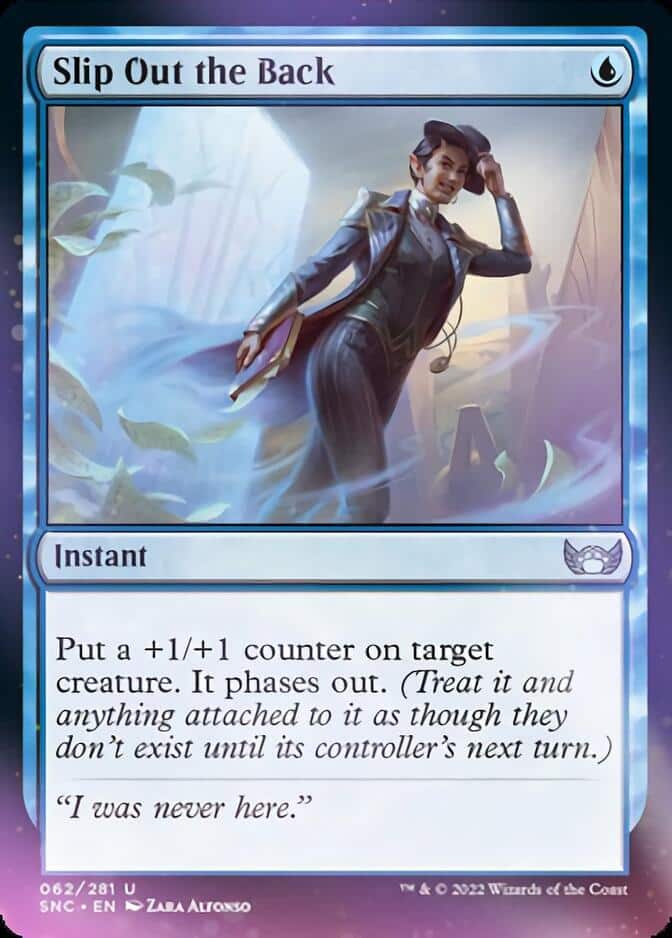 Slip Out the Back, however, is a one-mana trick that lets your creature phase out, letting it keep all the counters the creature had on it.