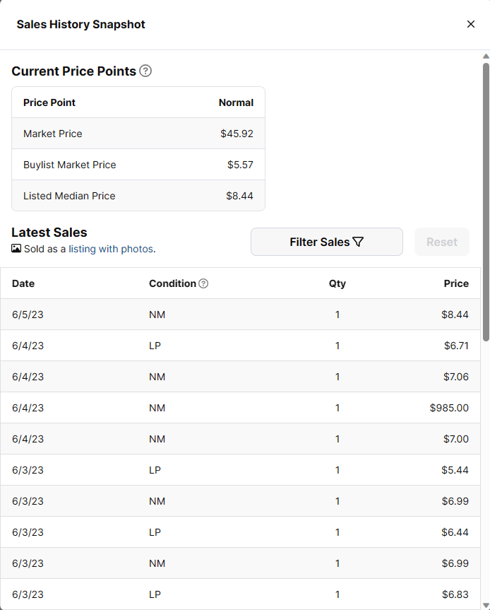 On average, Species Specialist appears to sell for between $6 and $7 – at least with one familiar exception. Yesterday, this card also experienced a bizarre $985 sale that sent its secondary market price out of whack. Even though its market price is listed for $45, the card continues to sell for around where it did previous to its sale, maybe even for a little more.