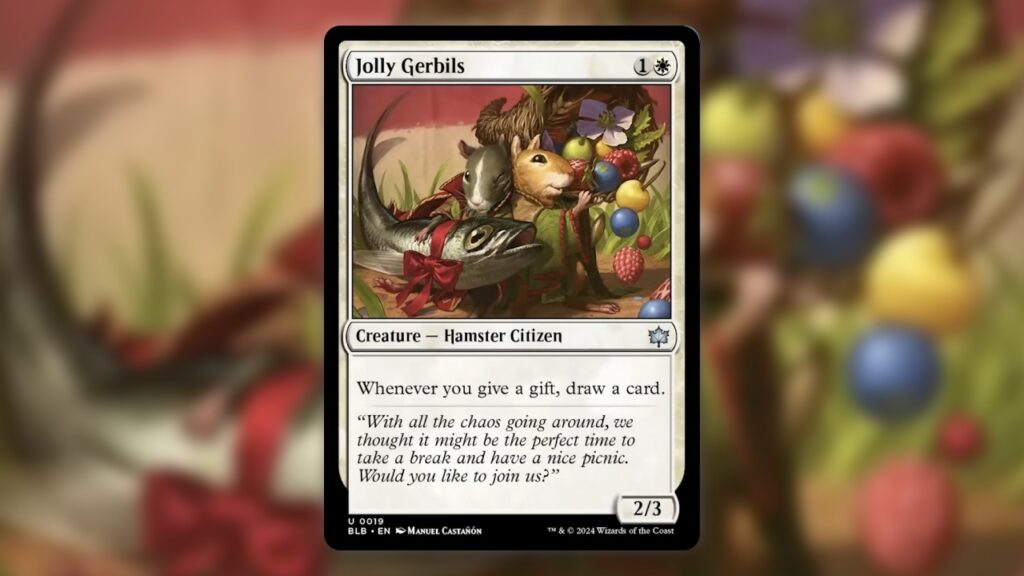 There’s a lot to love about Jolly Gerbils. It’s the first ever nontoken Hamster in Magic for a start, following in the tiny footsteps of the venerable Boo. It’s also a two mana 2/3, which is solid even in 2024. What’s most interesting about the card, though, is how it rewards you for engaging with Gift, one of Bloomburrow’s signature set mechanics.