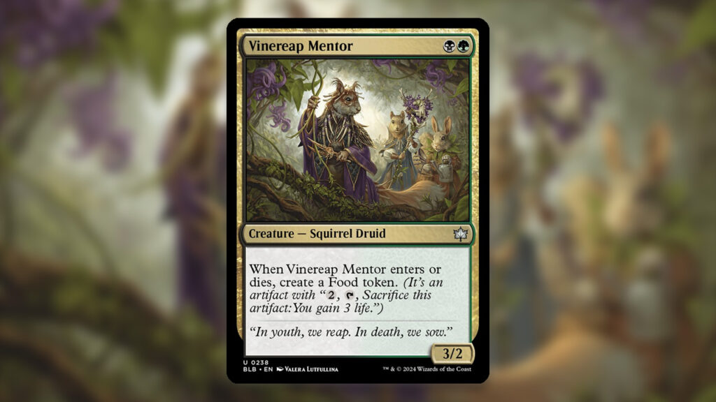 The best uncommon MTG card in Bloomburrow, according to these metrics, is the Golgari signpost payoff Vinereap Mentor. The card is rather simple in design, offering a 3/2 that creates a Food token on entry and when it dies. Yet, the creation of two Food tokens on a creature with decent stats is incredible. This fuels a ton of token synergies that appear in the Rabbit archetype, as well as the Forage mechanic that appears in the Squirrel archetype.