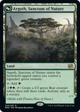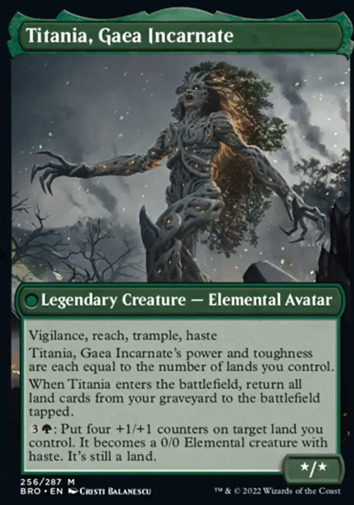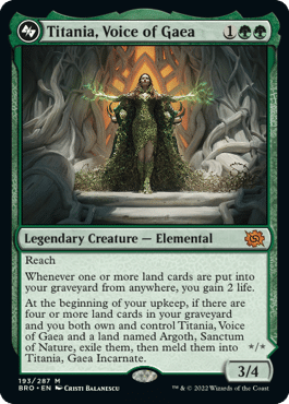 It looks like Ramp may finally have a decisive win condition in Standard and Pioneer! Titania, Gaia Incarnate is a walking death sentence to any opponent who should face it!… and not remove it immediately upon entry. At worst, Titania should be able to create a 4/4 land creature if it happens to go up in smoke too quickly. On the plus side, this Meld creature is uncharacteristically easy to assemble compared to the other options in this set. All you need are both these cards present on upkeep plus four lands in graveyard. Both of these cards also synergize well with self-milling lands to help along the process.