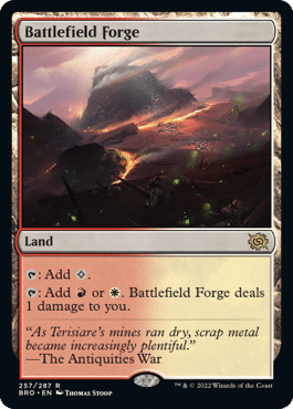 “As this war escalates, the events of which are going to influence not only Dominaria, but the Multiverse itself,” states Matt Danner, a Senior Creative Lead at Wizards of the Coast. “The Brothers’ War has left an indelible mark on Dominaria itself,” is stated when looking at the destruction marked by the four Pain Lands present in this set. Brushland, Battlefield Forge and Underground River all detail a war-torn Dominaria one may expect to see at the beginning of a dystopian story.
