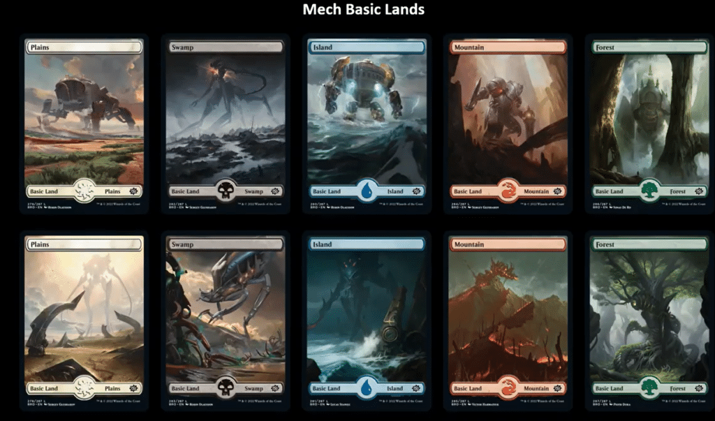 Here, we have a beautiful showcasing of full-art lands coming in The Brothers’ War. Titled the “mech basic lands,” these lands depict the difference in style between both brothers’ weapons. “Urza’s mechs are depicted by the top row here, and Mishra’s mechs in the bottom row.”