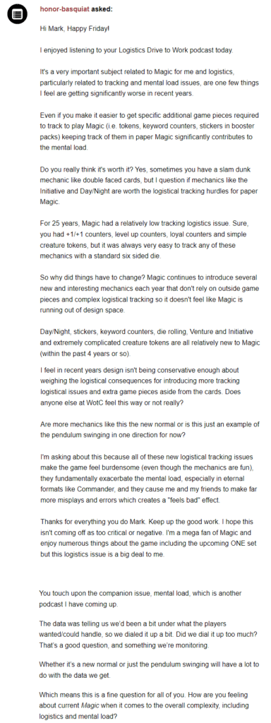 The thrust of their argument was that they felt, logistical and complexity issues have been getting worse in the game in recent years. They used mechanics like stickers, daybound/nightbound, and keyword counters as examples of logistically complex gameplay. They wanted to know whether this would be magic’s “new normal” or whether this is something that will get dialed back in future.