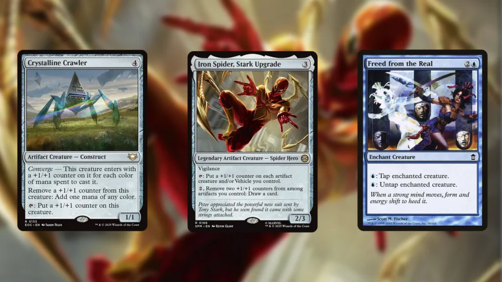 The simplest version of an Iron Spider, Stark Upgrade infinite combo involves Crystalline Crawler and some sort of untap tool. Using Freed from the Real as an example, this three-card infinite combo offers infinite +1/+1 counters on all of your artifact creatures except for the Crawler itself. Here’s how it works: