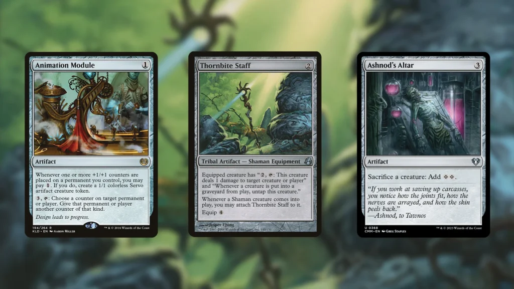 Combining Animation Module and Thornbite Staff, with Iron Spider, for example, goes infinite as long as you can sacrifice creatures for mana. If you use Ashnod’s Altar or Krark Clan Ironworks as your sacrifice outlet, you get a completely colorless infinite combo that creates infinite mana, card draw, enters, death triggers, and more. Here’s how the combo works: