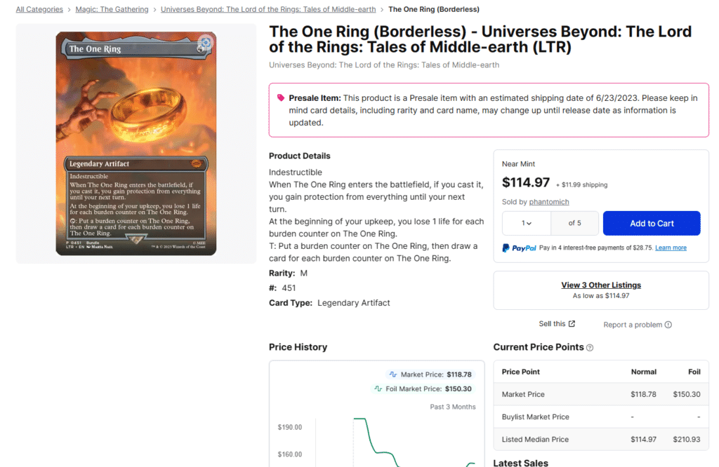 That’s right, the above full-art The One Ring will be available in every single bundle product that players buy. Regardless of this, copies of The One Ring’s full-art version are currently selling for more than $100 on TCGplayer! Considering that The One Ring will be so easy to access, its early pricing is rather bizarre. It should also be noted that there doesn’t seem to any particular party at fault for this. At the moment, this price is simply what The One Ring is selling for on the site.