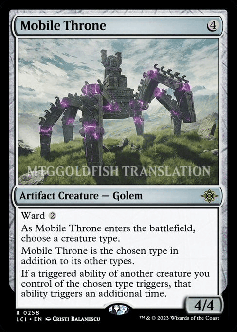 Ward 2 can make cheaper removal options a lot more costly to deploy. On the other hand, being a creature does open Mobile Throne to board wipes. This can make the Throne a little riskier to play with ETB strategies since there are so many other alternatives available. Where Mobile Throne really shines is when doubling triggers for creatures that are not ETB ones.
