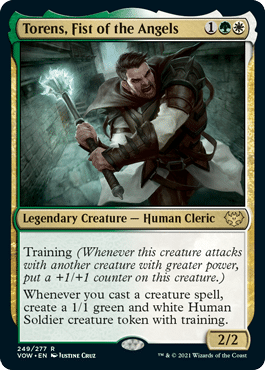 But Torens’s tokens are better than average; they have the new Training mechanic, which means they can get much, much bigger their baseline stats. That’s why people are comparing Torens to a creature-centric Monastery Mentor, a legacy playable card.