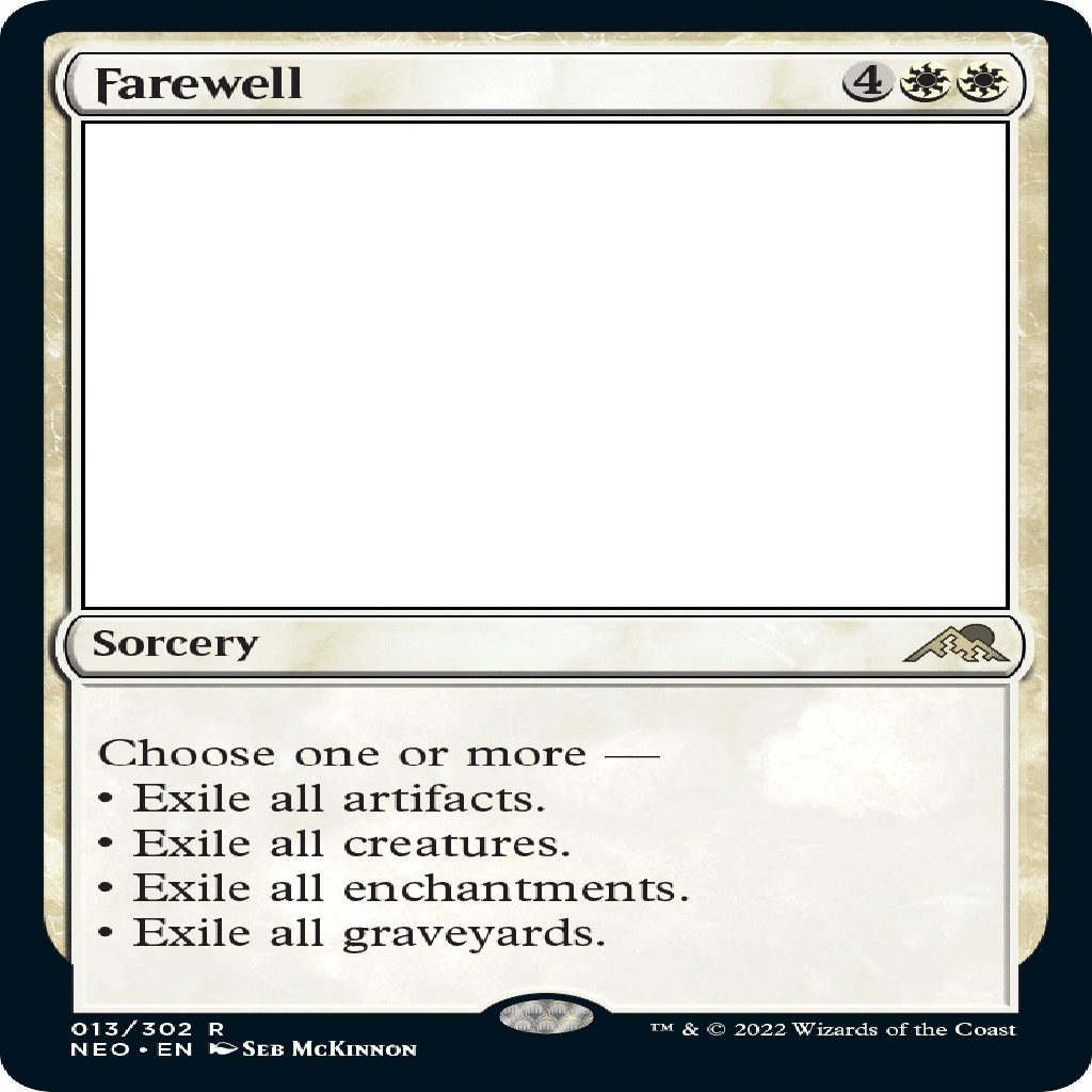 So the card that we’re going to look at is called Farewell. Its’ a 6 mana Sorcery that gives you some choices. You can choose any number of the following: