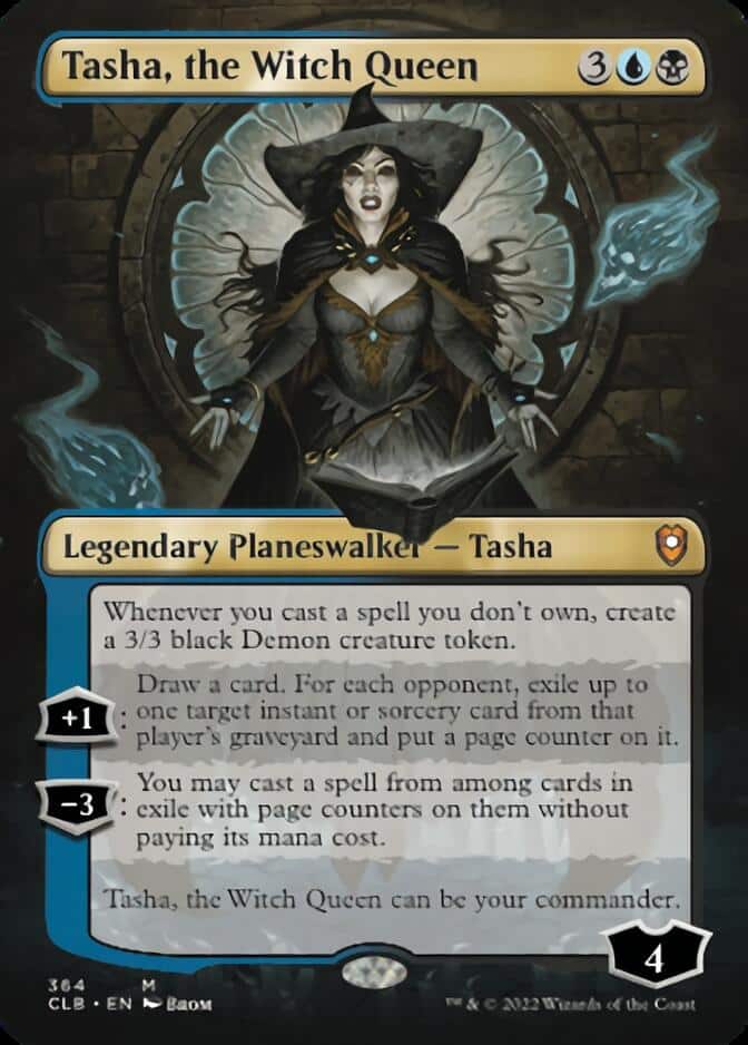 Welcome Tasha, the Witch Queen to the party! Tasha is one of the new Planeswalkers in Battle for Baldur’s Gate, and boy does she have a LOT going for her. She’s 5 mana in the Dimir colors, and she has 4 starting Loyalty. The first cool thing about her is that she can be your commander!