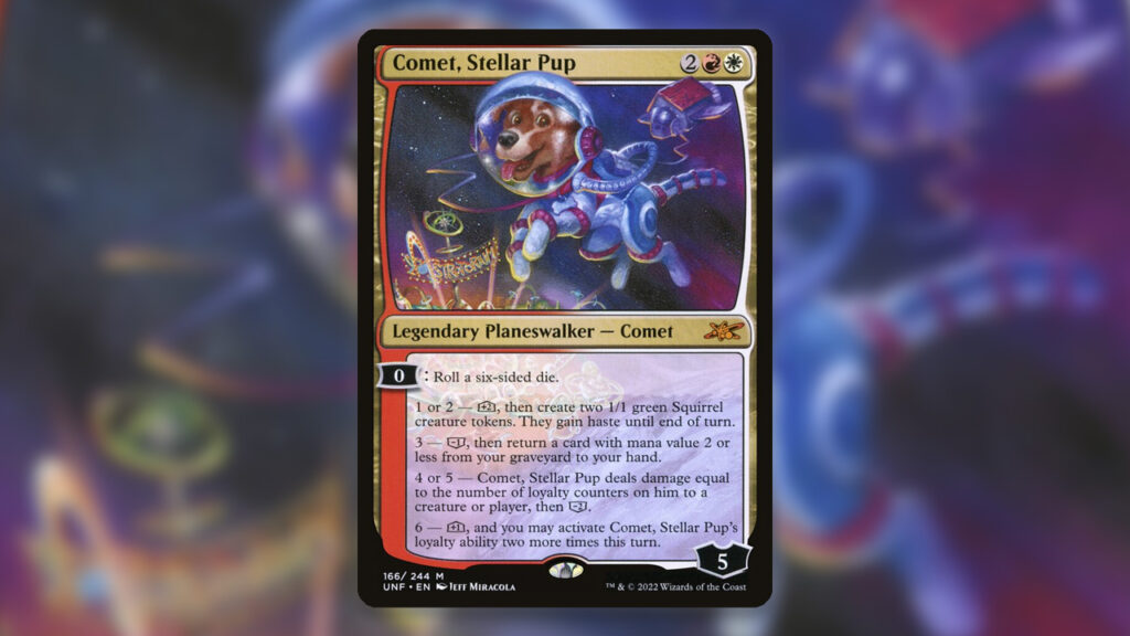 There are some powerful dice-rolling cards in the game thanks in-part to the decision to make Unfinity partially black-bordered. Comet, Stellar Pup is a cute and powerful Planeswalker that takes dice-rolling to an extreme.