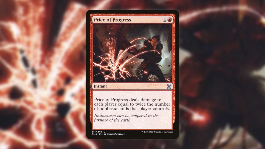 Notably, your opponent can also use their copies of Wasteland to blow up their own nonbasic lands so that they take significantly less damage. As such, setting up the best possible Price of Progress takes some work.