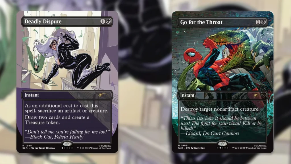 Go for the Throat does see some Pioneer play, though its demand has lowered since it rotated out of Standard. Deadly Dispute also sees some Pioneer play in Food decks, though it also took a recent hit after getting banned in Pauper. The flavor is certainly there for these Secret Lair cards, but that hasn’t stopped players from voicing their frustrations.