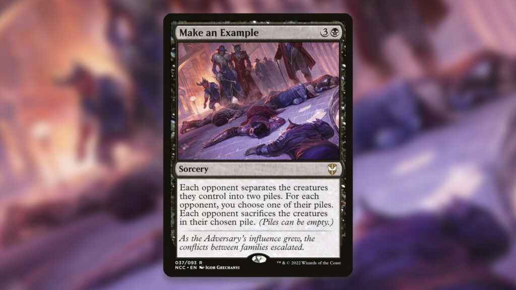 Make an Example forces opponents to separate all of their creatures into two piles. You choose one, and those creatures are sacrificed. Considering that this effect does not apply to you, the card probably functions better than it initially looks.